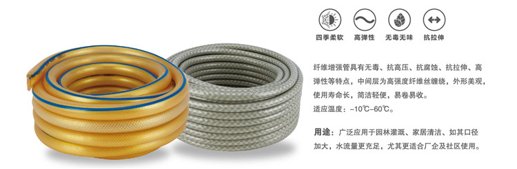 纖維增強管具有無毒、抗高壓、抗腐蝕、抗拉伸、高彈性等特點,中間層為高強度纖維絲纏繞,外形美觀,使用壽命長,簡潔輕便,易卷易收。適應溫度: -10C- 60C。用途:廣泛應用于園林灌溉、家居清潔、如其口徑加大,水流量更充足,尤其更適合廠企及社區(qū)使用。